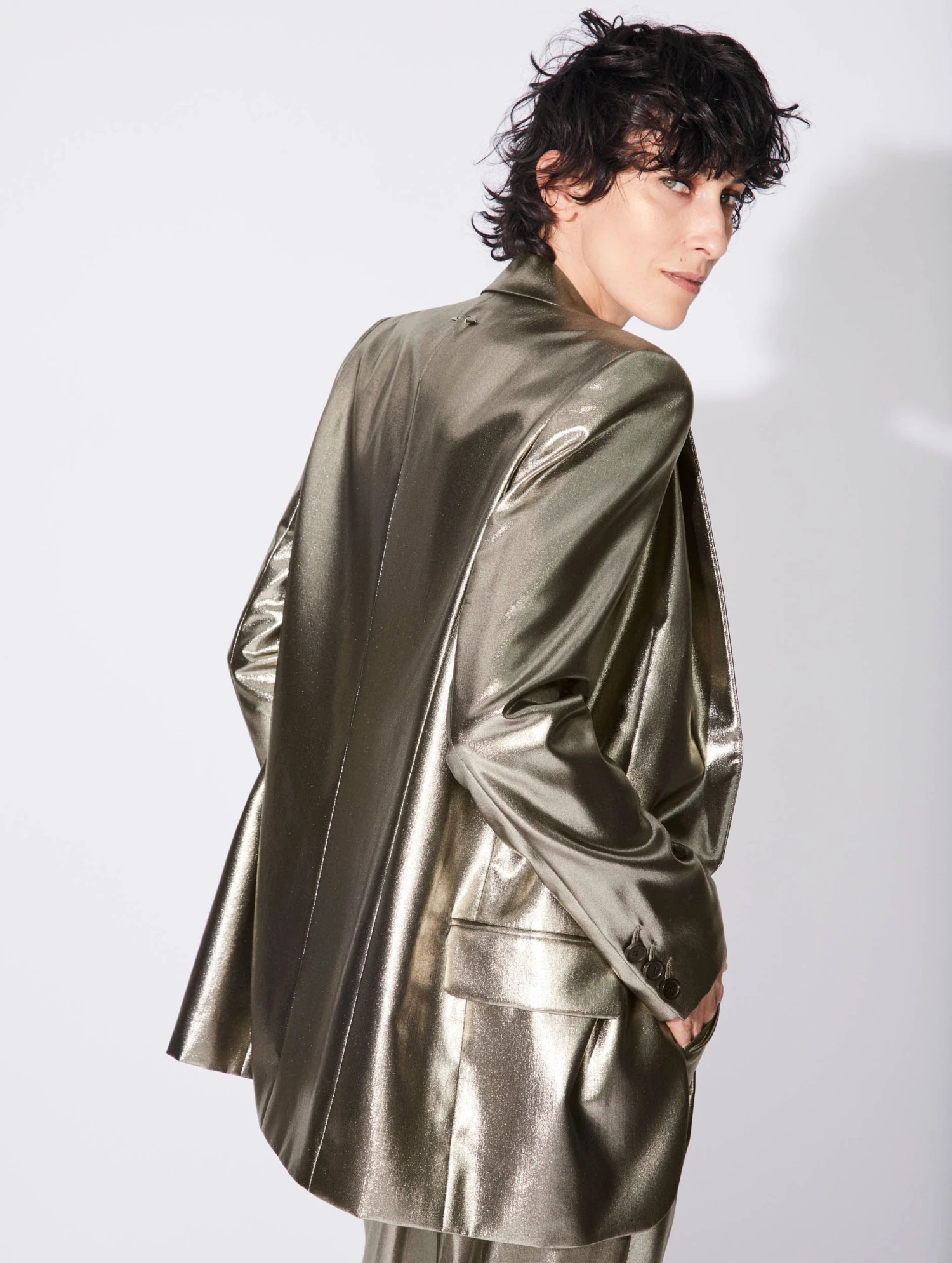 Pour un parfait équilibre entre décontraction et sophistication, cette veste de costume droite en lamé gold, integralement doublée adopte une coupe boyfriend ample à la fois confortable et tendance. Son col smoking dégage le décolleté, idéale pour porter cette veste superposée au caraco dos nageur assorti avec son pantalon à plis en lamé. Jeu d’équilibre parfaitement maîtrisé entre les codes féminins et masculins, cette veste toute en légèreté est accessoirisée de notre iconique piercing amovible au dos.