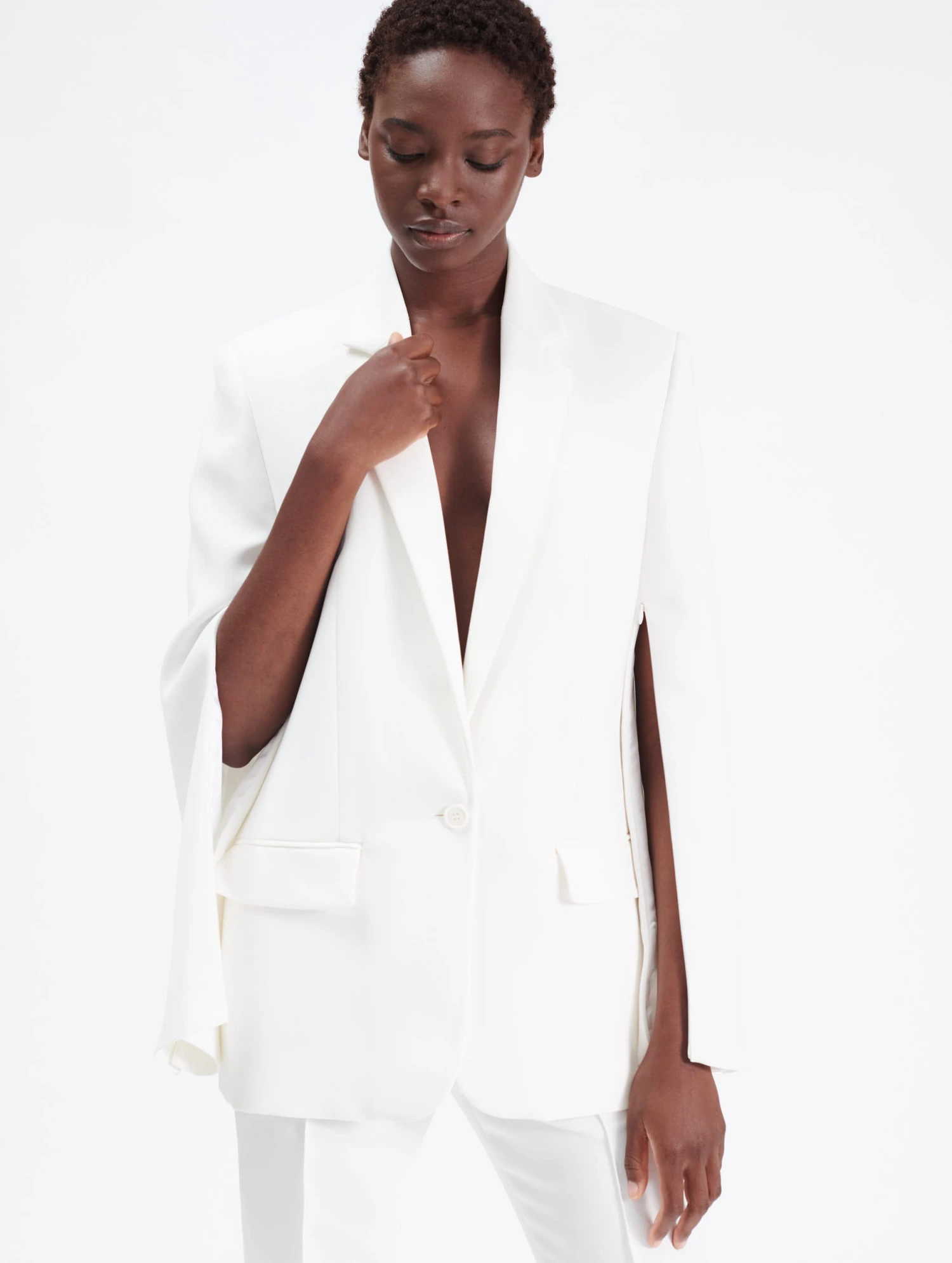 La silhouette androgyne ayant fait la réputation de notre maison repose sur un subtil jeu de détails et de proportions. Pièce emblématique du vestiaire féminin, la veste de costume en crêpe léger allonge la silhouette grâce à sa coupe longue et droite légèrement oversize. Une patte de boutonnage et de discrets zips en bas de manches permettent de porter cette veste légère femme ouverte ou à la manière d’une cape tout en structurant l’allure. Élégante et facile à porter, cette veste femme de la mi-saison pourra être portée avec le pantalon de costume et le gilet assorti pour une réinterprétation féminine de l’iconique costume trois-pièces. Portée à même la peau et révélant subtilement le détail d’un short, cette veste de notre collection printemps-été composera une silhouette estivale minimaliste.