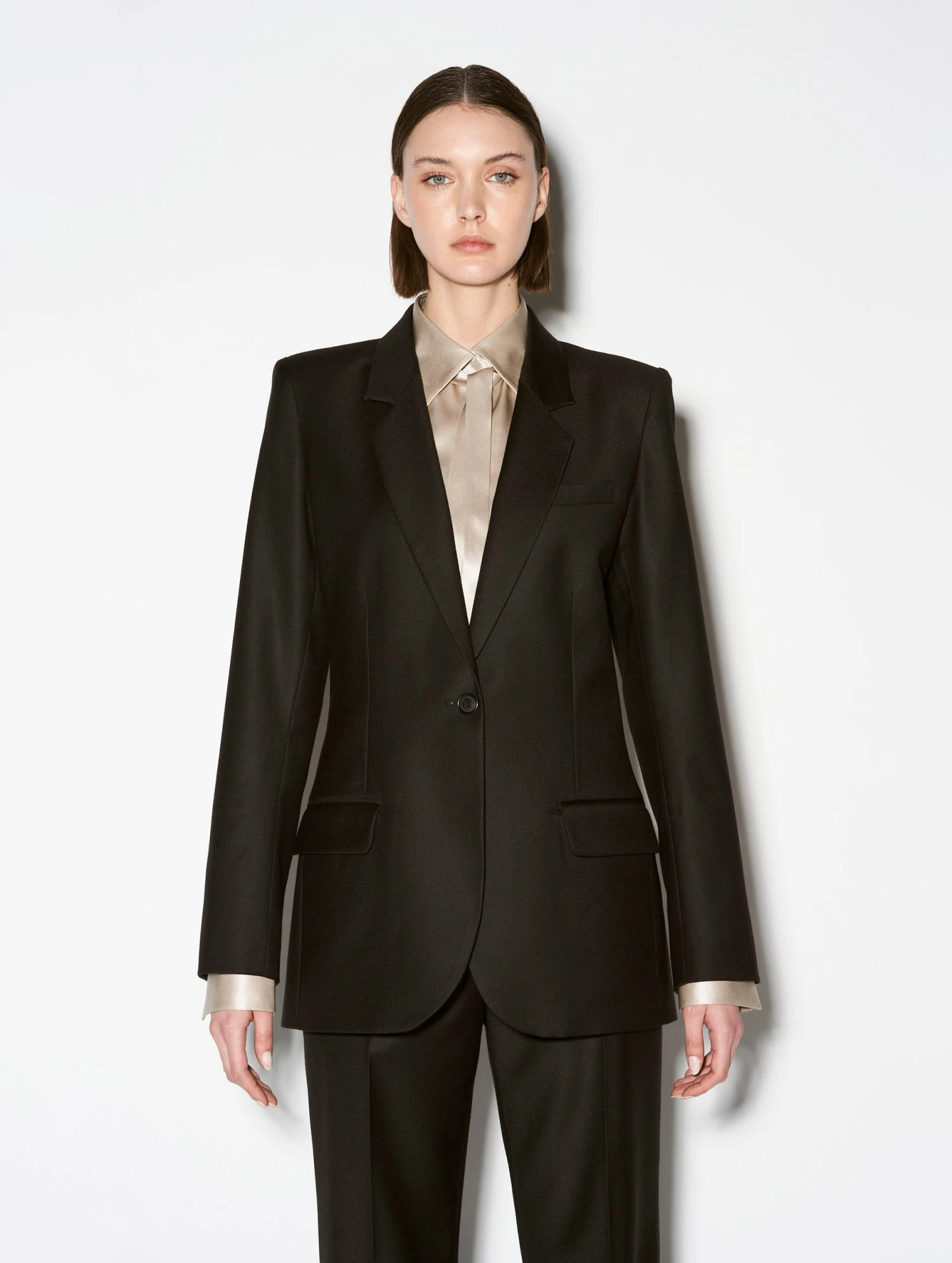 Cette veste de costume pour femme rend hommage au savoir-faire de nos ateliers comme à l’amour que porte notre créatrice aux pièces tailoring empruntées au vestiaire masculin. Cette veste noire à la coupe classique légèrement cintrée met parfaitement en valeur la silhouette féminine grâce à son jeu de coutures marquant élégamment le dos et sa fente arrière assurant confort et liberté de mouvement. Dotée de trois poches passepoilées et de poignets boutonnés, cette veste tailleur femme confectionnée dans une gabardine de laine et cachemire révèle une doublure soignée couleur corail soulignée d’un passepoil rose fluo. Au dos, notre iconique bijou piercing amovible en métal argenté rappelle l’impertinence rock chère à Barbara Bui.
