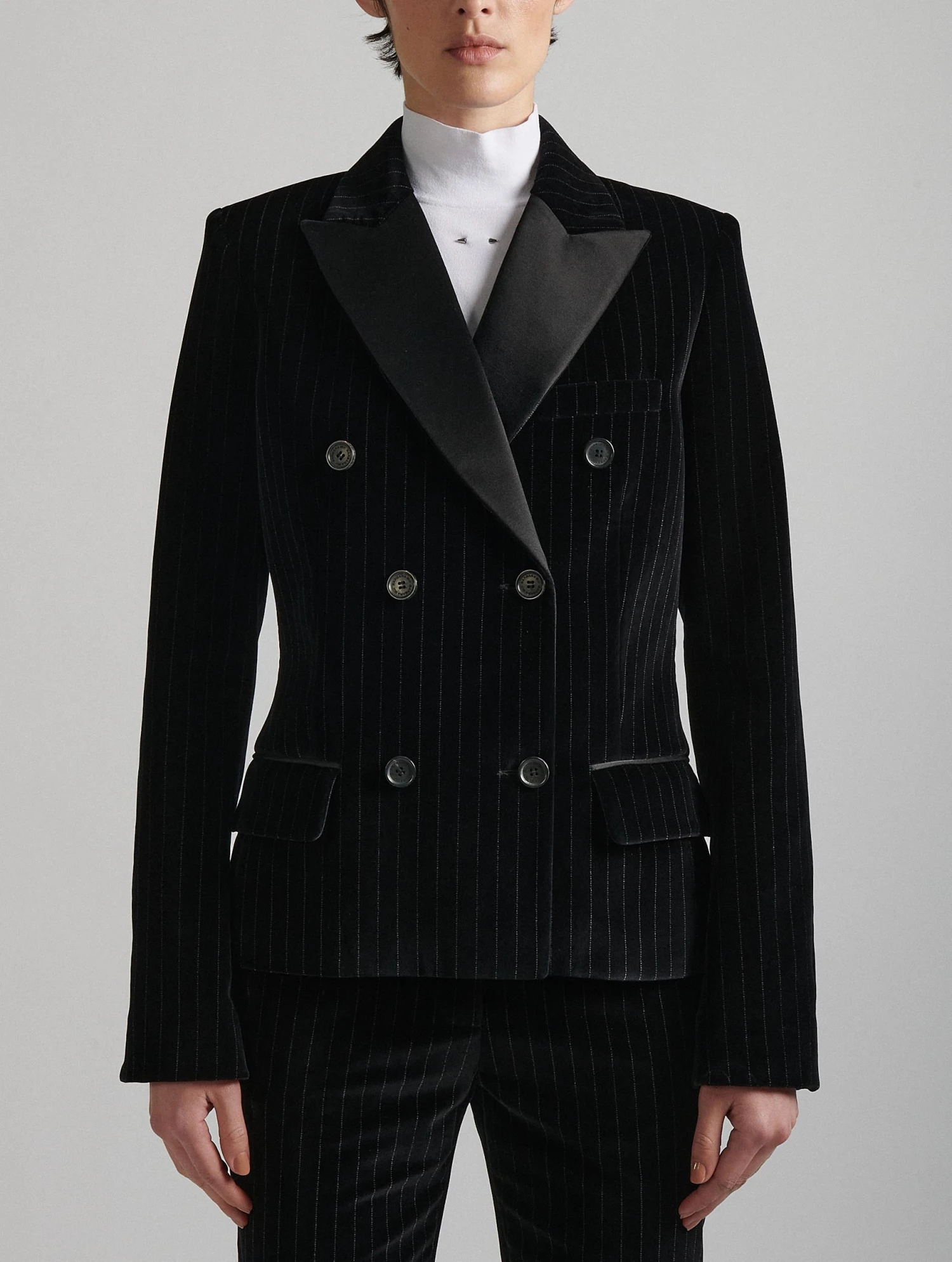 Pour une une allure rock et sophistiquée, cette veste de smoking est réalisée dans un velours noir à fines rayures. Sa structure est soulignée par un col à pointe en satin noir et un double boutonnage. Dotée d’une poche poitrine et de deux poches à rabats passepoilées, cette veste en velours rayé dispose de toutes les finitions propres aux plus belles pièces tailleur. Au dos, le bijou piercing amovible en métal argenté, signature de la Maison. Portée avec le pantalon en velours rayé assorti, cette veste vous promet une tenue d’une remarquable élégance.