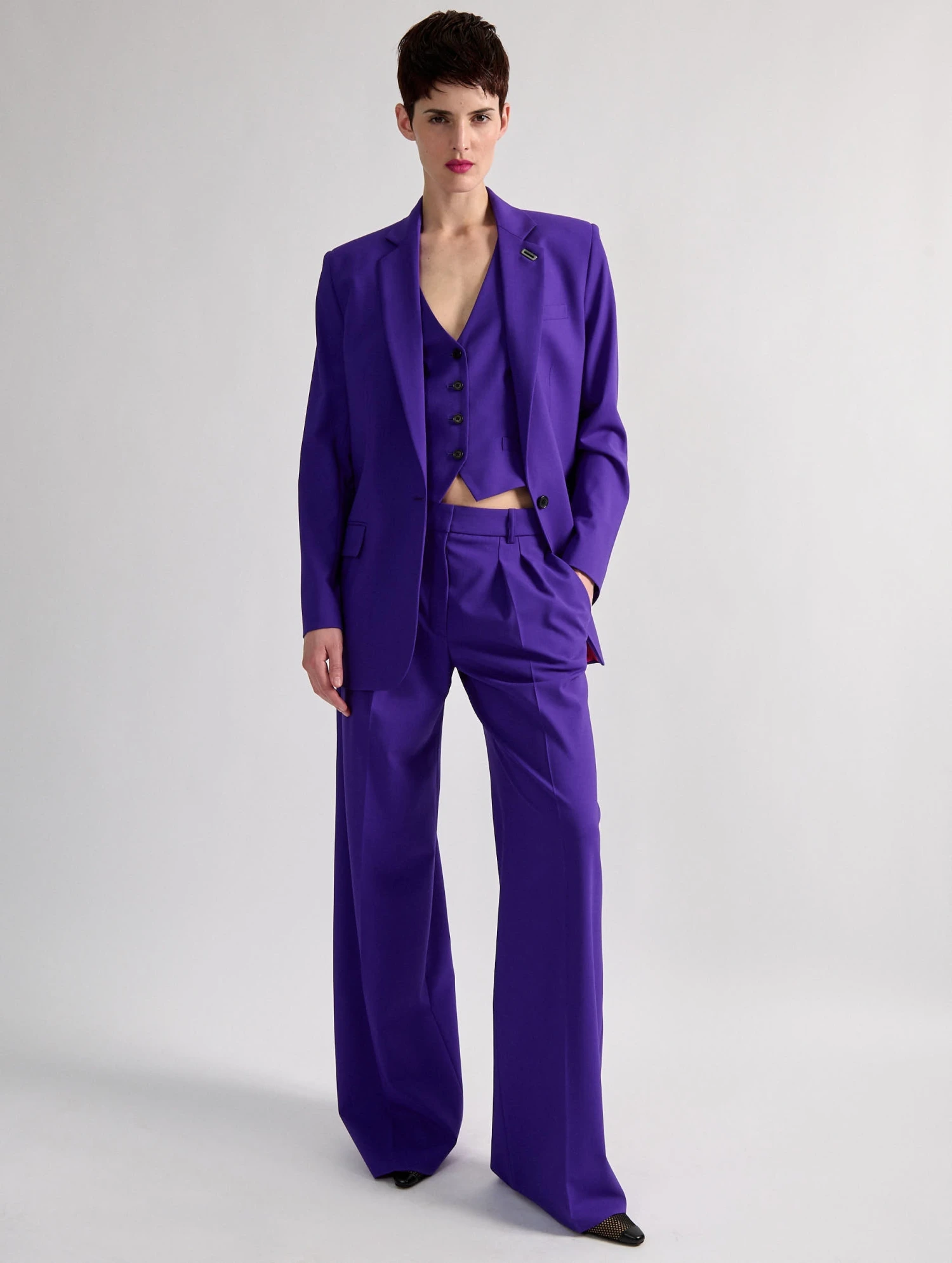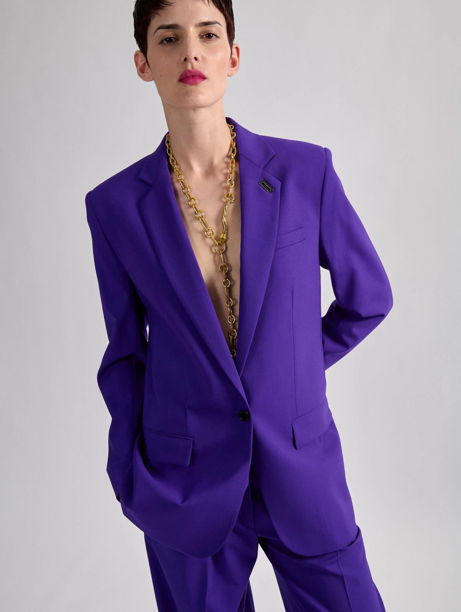 Cette veste de costume droite à la coupe boyfriend est proposée dans une toile de laine stretch en coloris noir ou violet. Elle se porte à sa taille pour une silhouette aux volumes maîtrisés mais peut également être surtaillée d’une ou plusieurs tailles afin d’obtenir un volume oversize volontairement exagéré. Se fermant à l’aide d’un bouton, cette veste dispose d’une patte de rappel permettant de l’entrouvrir tout en lui assurant un tombé impeccable. Détail rock, sa boutonnière milanaise s’orne d’un passant en métal siglé Barbara Bui. Associée au gilet de costume et au pantalon taille basse assorti, cette veste renouvelle les propositions de costumes-trois-pièce.