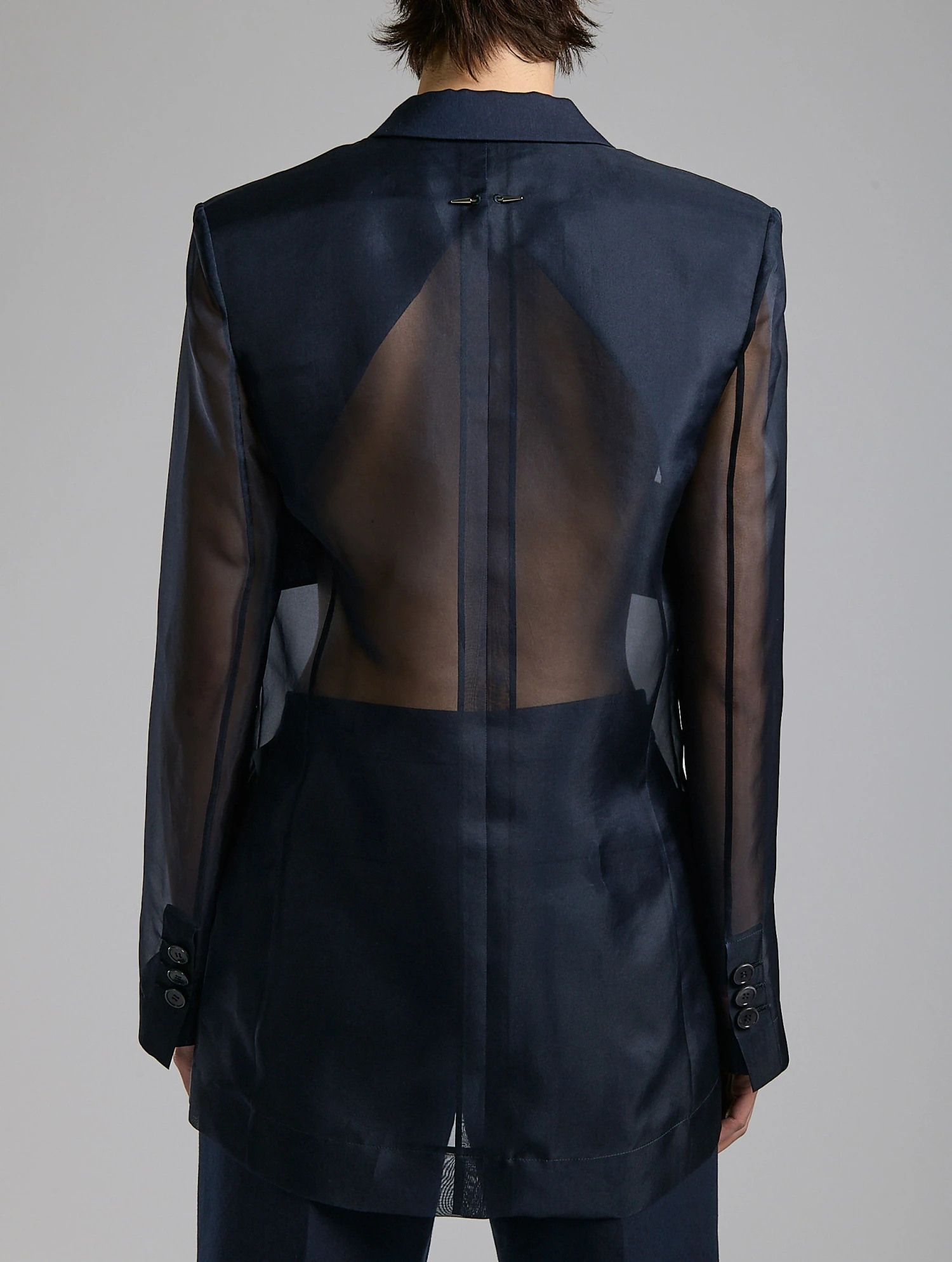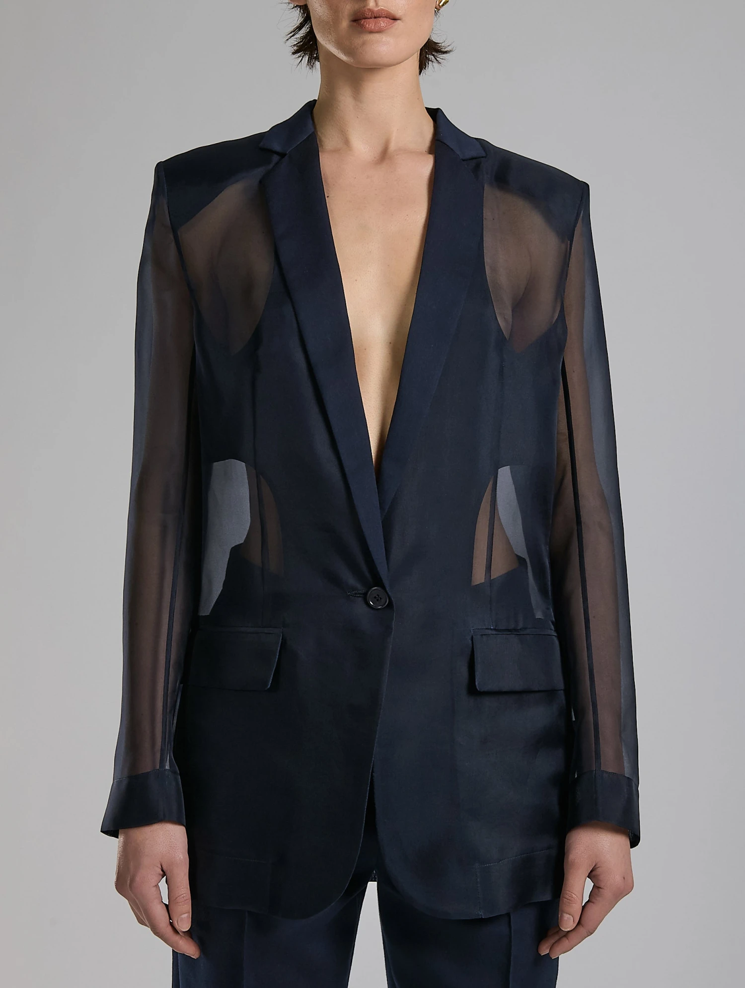 Intégralement réalisée en organza de soie, cette veste de costume toute en légèreté est un hommage à une vision féminine et sophistiquée du tailoring. La minutie des finitions et la construction de cette veste permettent d’affirmer sa sensualité tout en maîtrisant sa transparence, que vous la portiez sur notre bustier, un top ou à même la peau. Proposée dans une teinte seconde nude ou bleu marine, cette veste donne vie à une silhouette éthérée et élégante portée associée à son pantalon à l’occasion d’une soirée ou d’un évènement habillé.