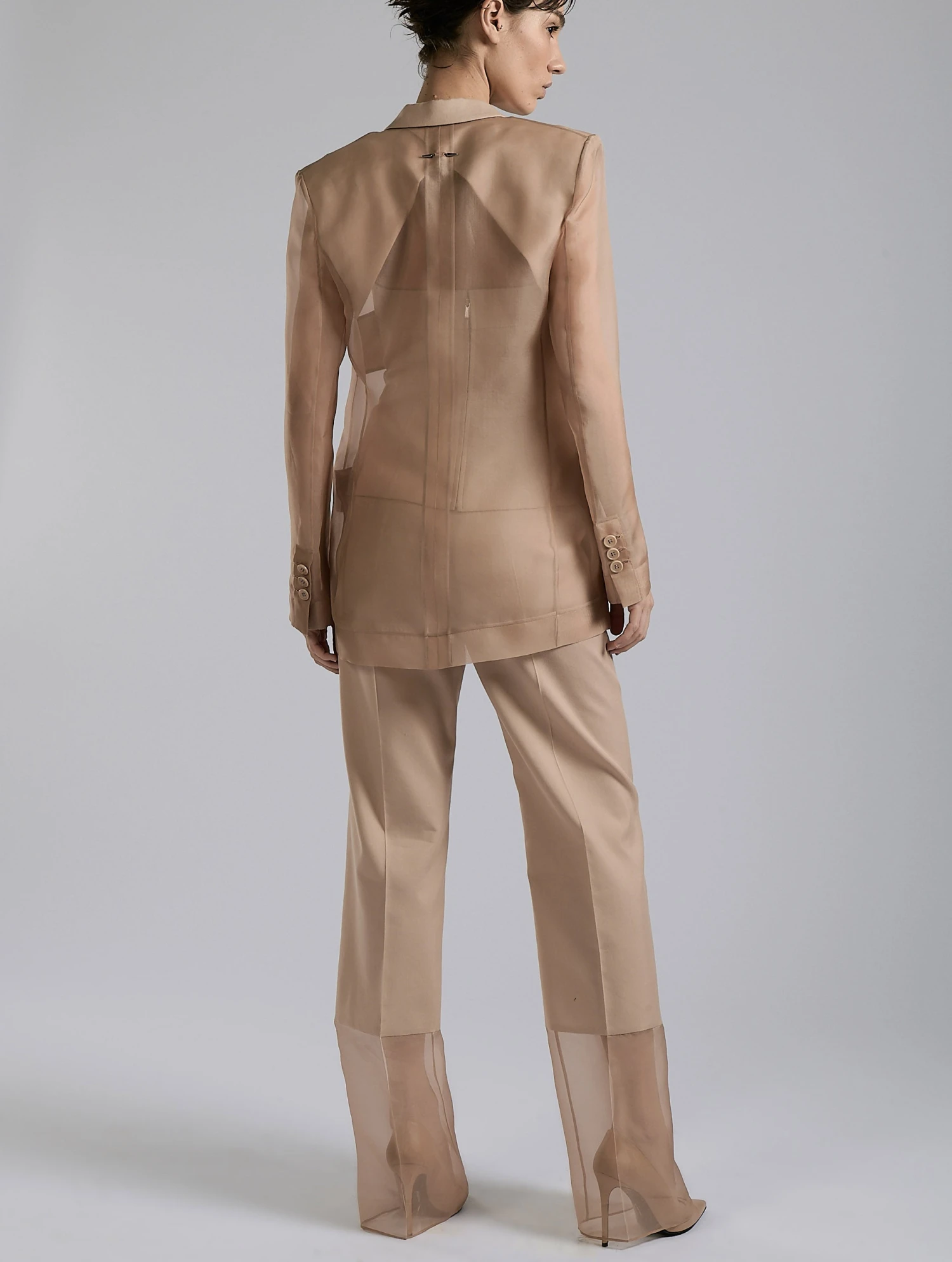 Intégralement réalisée en organza de soie, cette veste de costume toute en légèreté est un hommage à une vision féminine et sophistiquée du tailoring. La minutie des finitions et la construction de cette veste permettent d’affirmer sa sensualité tout en maîtrisant sa transparence, que vous la portiez sur notre bustier, un top ou à même la peau. Proposée dans une teinte seconde nude ou bleu marine, cette veste donne vie à une silhouette éthérée et élégante portée associée à son pantalon à l’occasion d’une soirée ou d’un évènement habillé.