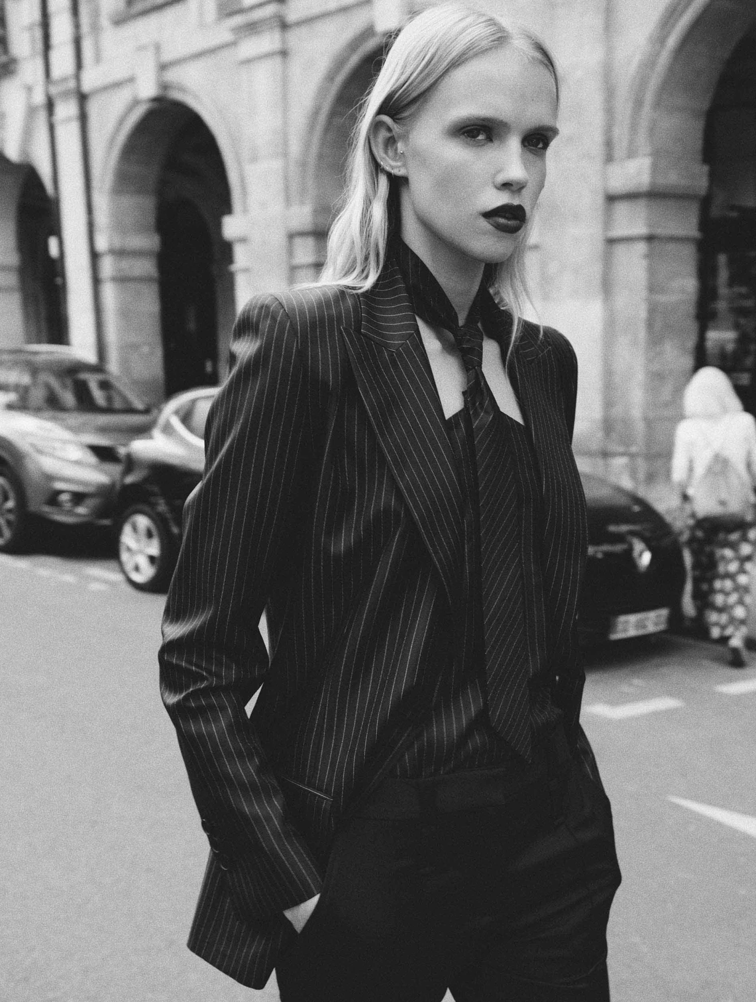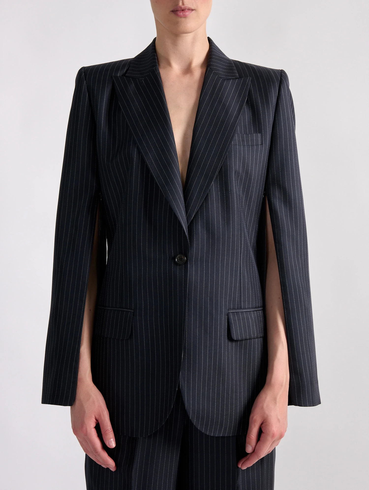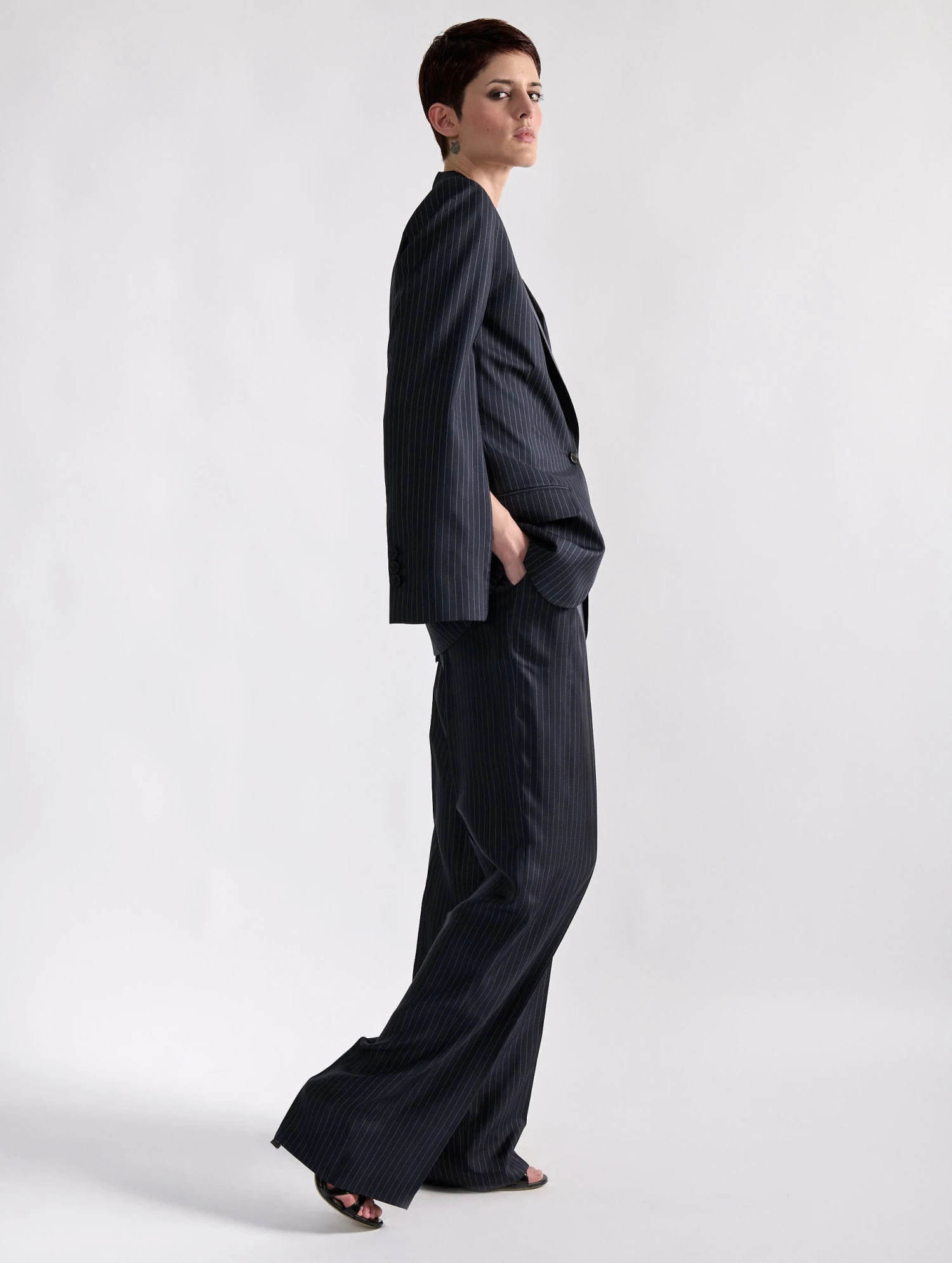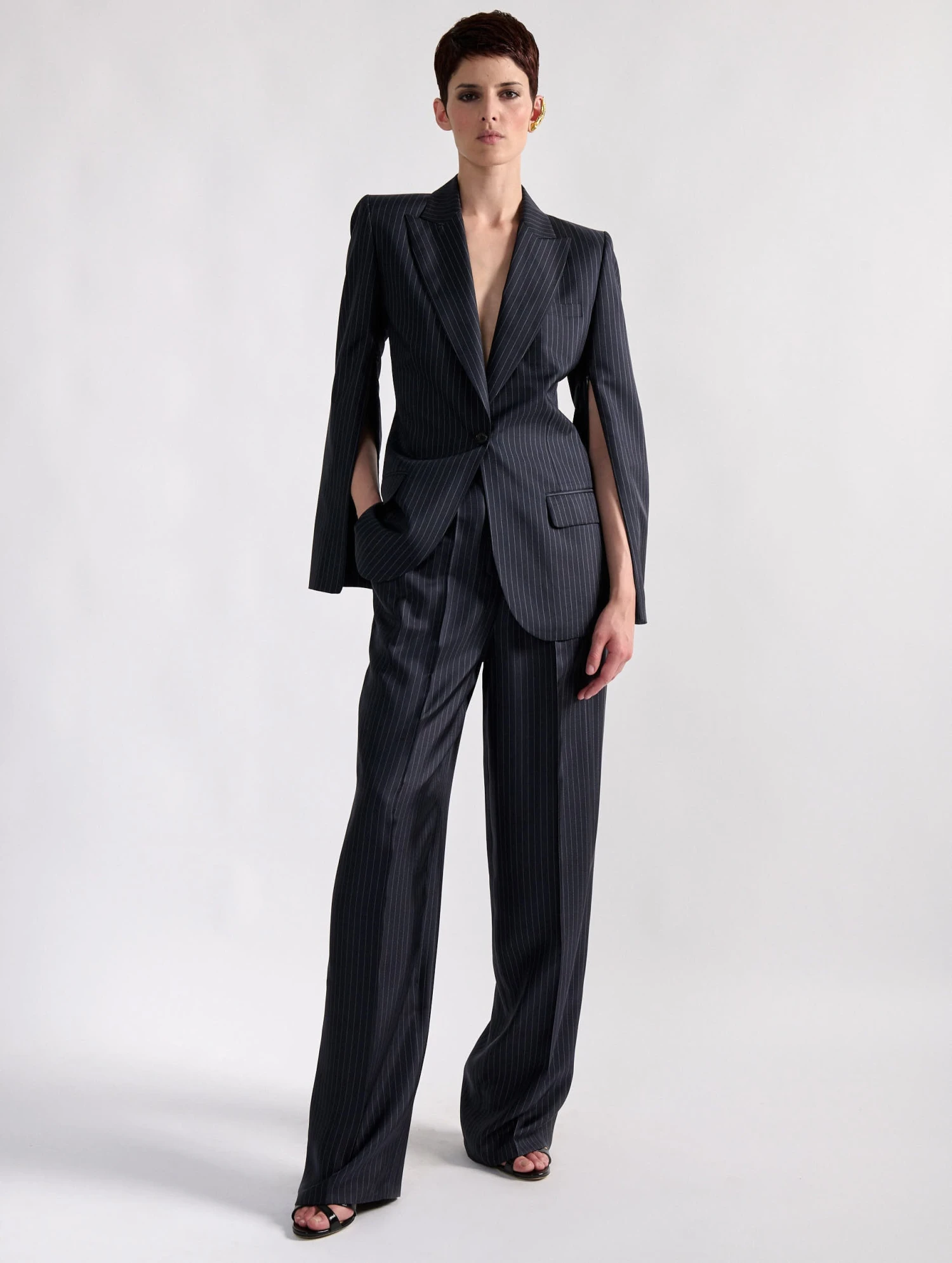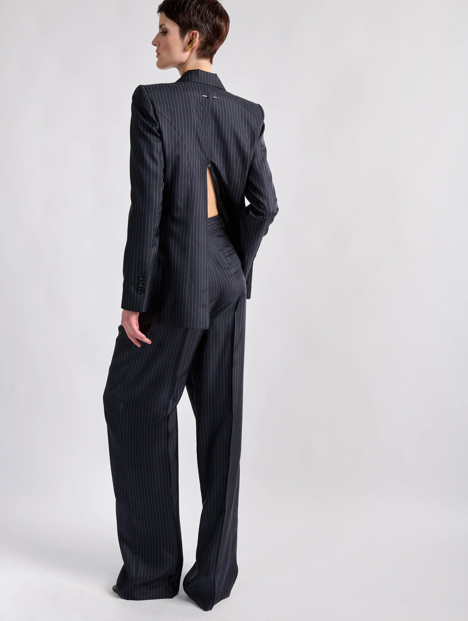 Inspirée des costumes italiens à rayures fines, cette veste trompe-l’oeil à la carrure appuyée opte pour une soie rayée plus légère et fluide qu’une laine tissée. Ses manches s’ouvrent à l’aide d’un astucieux zip invisible pour un porté proche d’une cape. Au dos, un zip permet d’ouvrir cette veste féminine, révélant l’arrière du pantalon assorti pensé par Barbara Bui pour compléter une tenue aux inspirations masculines revisitées.