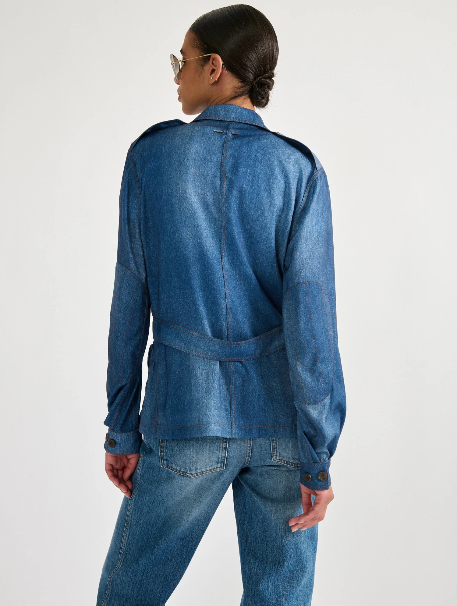 Avec sa taille élastiquée se prolongeant en ceinture dans le dos, ses pattes d’épaule et ses 4 poches plaquées, cette veste saharienne structure parfaitement l’allure. Réalisée dans un crêpe léger imprimé façon denim, cette surchemise remplacera un blouson en entrée de saison. Portez-la ouverte pour un tomber plus cintré ou déboutonnée sur un débardeur en coton blanc, associée à l’un de nos jeans pour un total look denim.