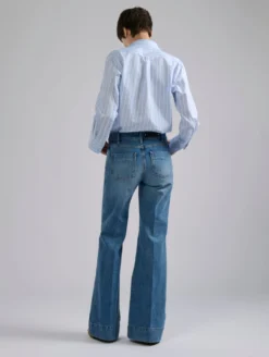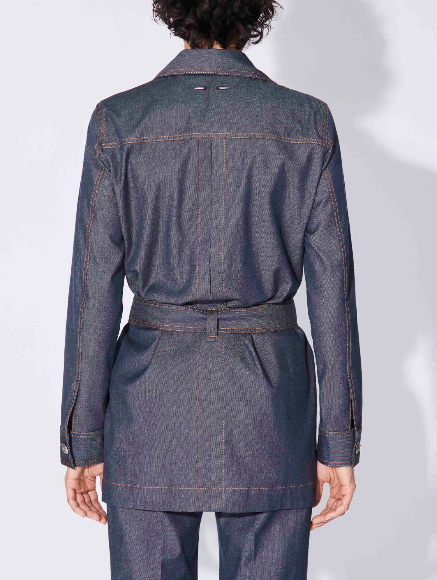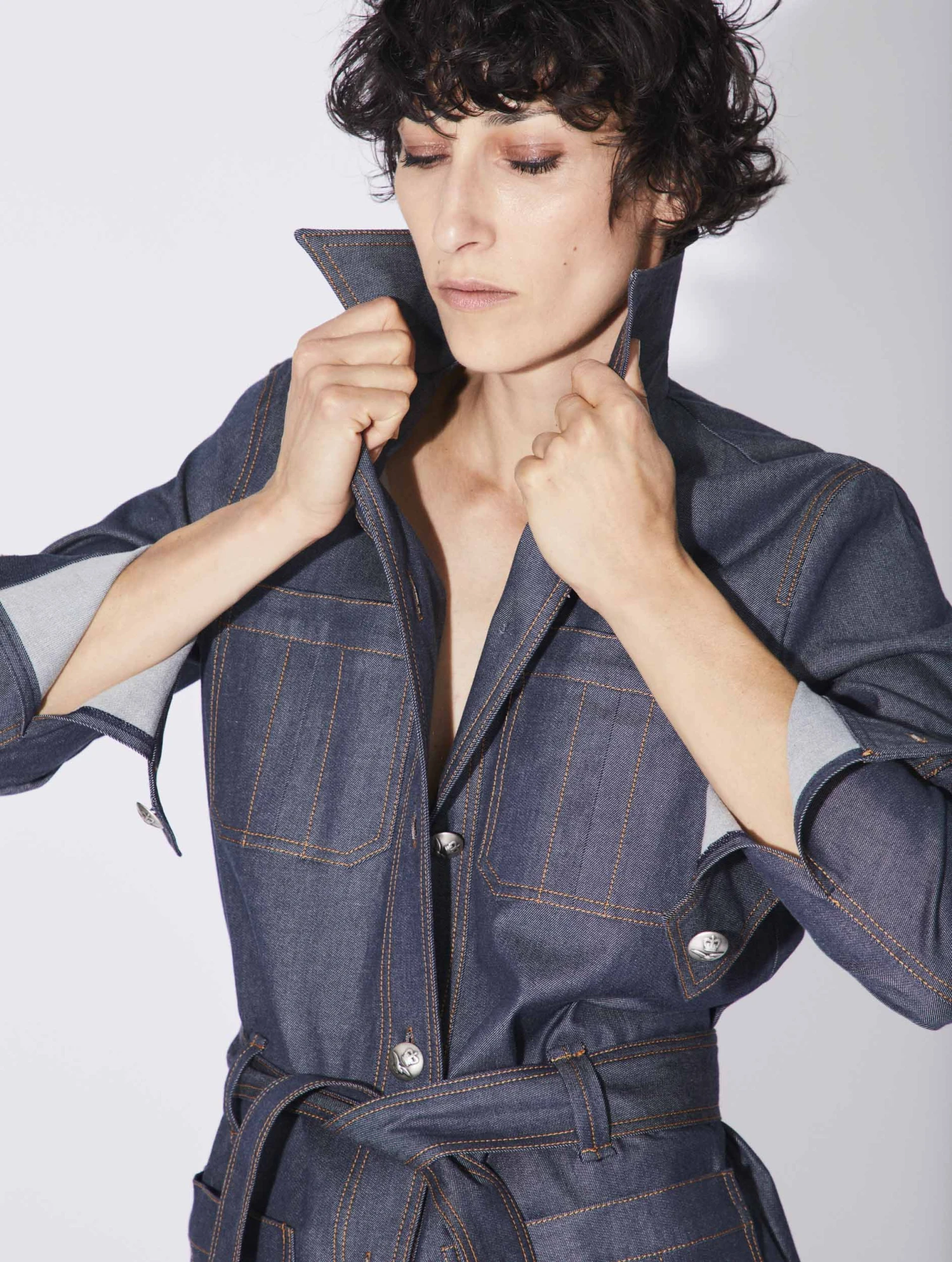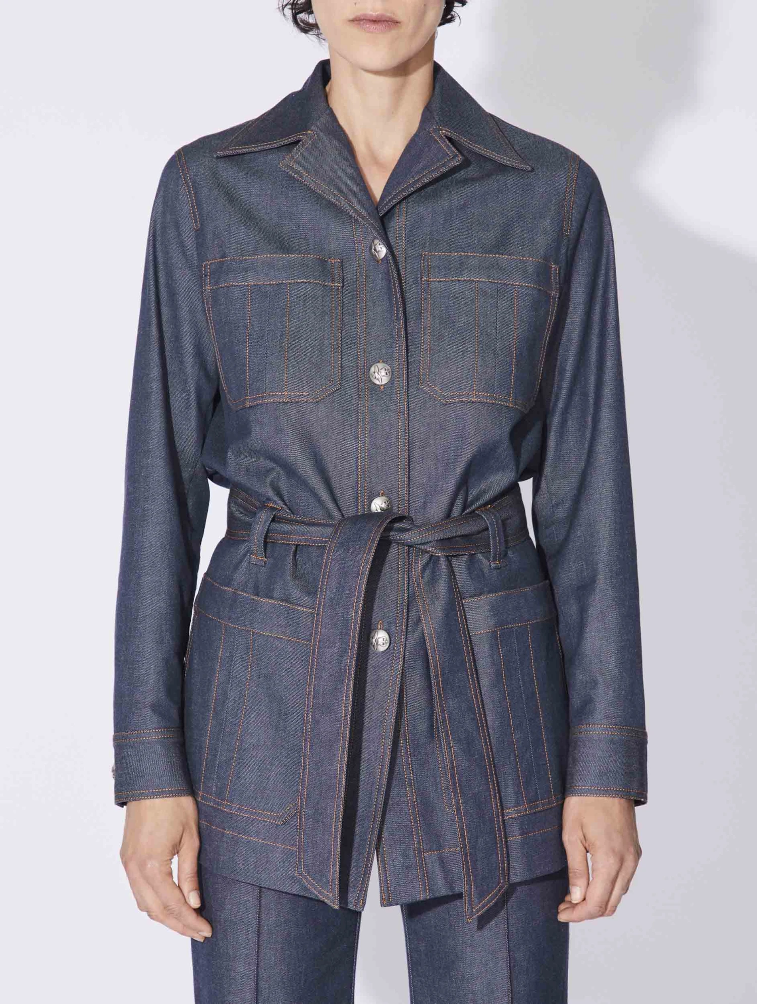 La toile de denim lavé transforme les vestes de la saison printemps-été en pièce ultra désirables, savamment décontractées. Cette veste saharienne femme en denim bleu à la coupe droite est dotée d’une ceinture pour souligner votre taille. Ses larges poches carrées et son travail de surpiqûres structurent élégamment la silhouette tandis que sa fente dos cousue met en valeur l’art de la coupe de nos ateliers. Son bijou piercing en métal argenté apporte une touche rock à cette veste ceinturée tendance dotée de boutions métal d’inspiration militaires. Ouverte ou non, cette saharienne en denim sera la pièce maitresse de vos looks associée au pantalon flare confectionné dans la même matière.