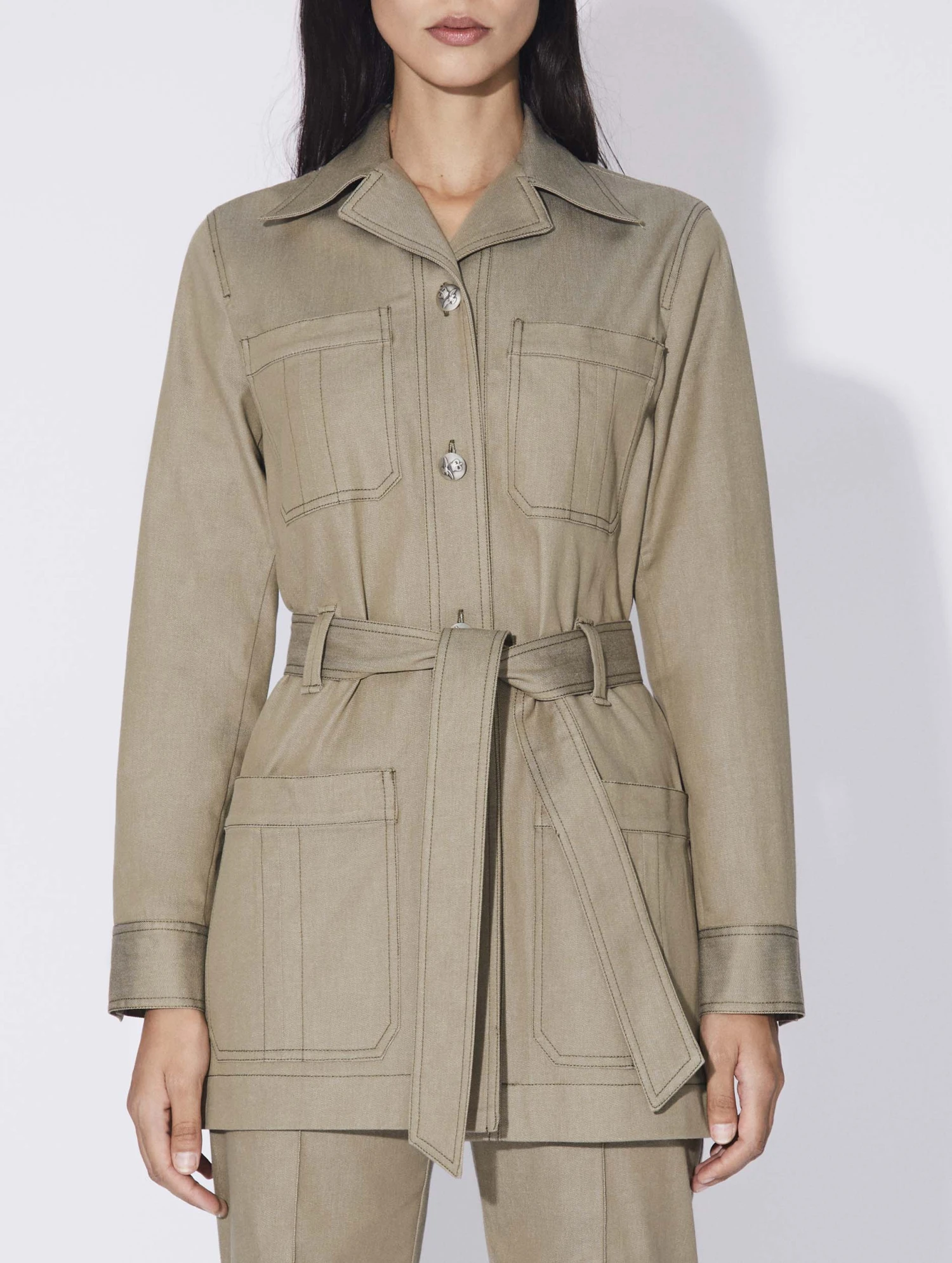 La toile de denim lavé transforme les vestes de la saison printemps-été en pièce ultra désirables, savamment décontractées. Cette veste saharienne femme en denim tilleul à la coupe droite est dotée d’une ceinture pour souligner votre taille. Ses larges poches carrées et son travail de surpiqûres structurent élégamment la silhouette tandis que sa fente dos cousue met en valeur l’art de la coupe de nos ateliers. Son bijou piercing en métal argenté apporte une touche rock à cette veste ceinturée tendance dotée de boutions métal d’inspiration militaires. Ouverte ou non, cette saharienne en denim sera la pièce maitresse de vos looks associée au pantalon flare confectionné dans la même matière.